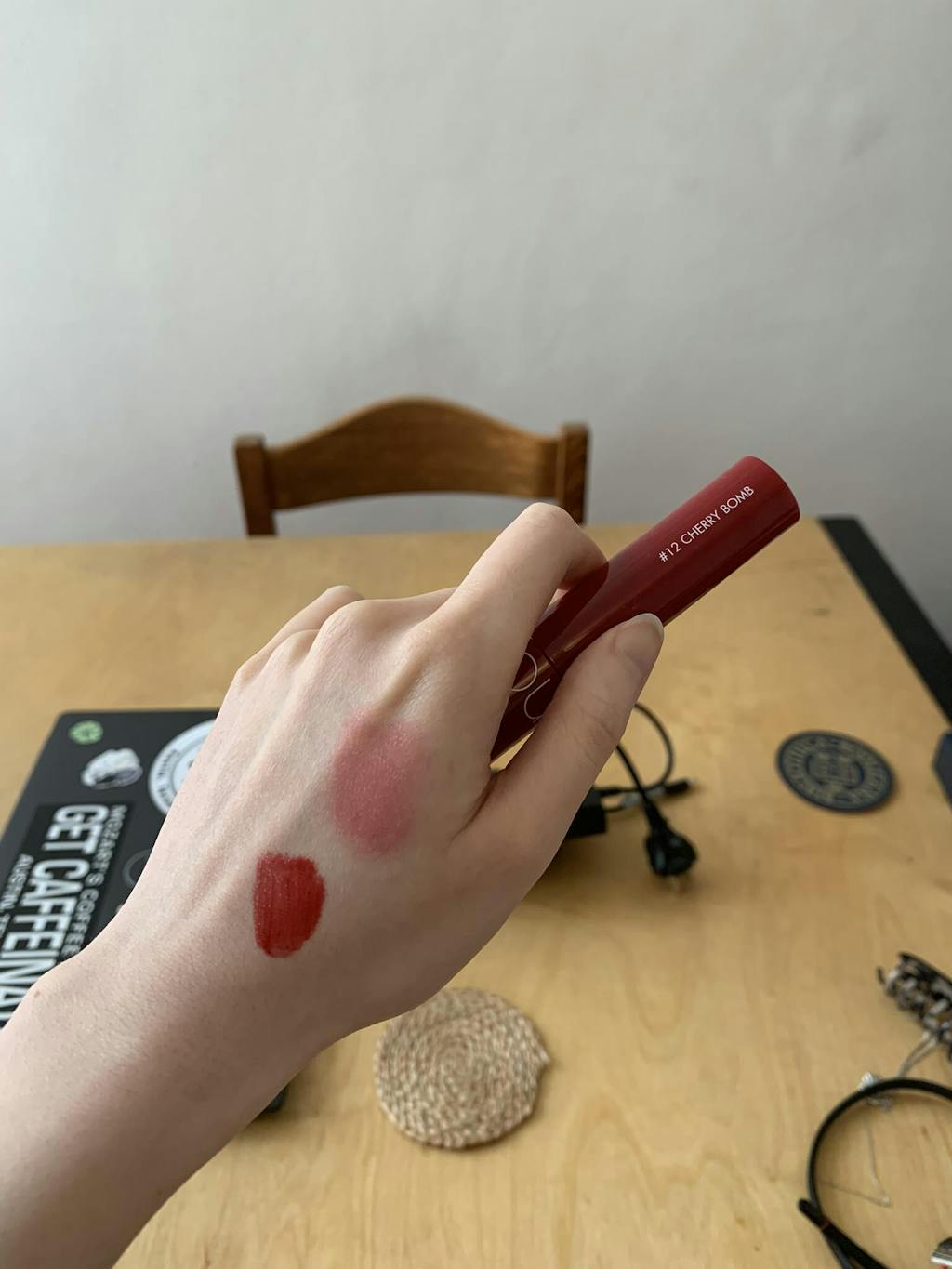 Shade I'm wearing: Cherry bomb (my camera doesn't capture colors well, in real life it is much more vibrant). It's an excellent lip tint for when you're looking for an alternative to matte and glossy (sticky) lips. I have the something-soda shade as well and it too is gorgeous. You have to reapply every once in a while and after you eat. It feels moisturizing and even when it's almost gone, it leaves your lips looking plump. It is scented (sweet, floral).Let it dry for a few seconds, otherwise it will get on your teeth.